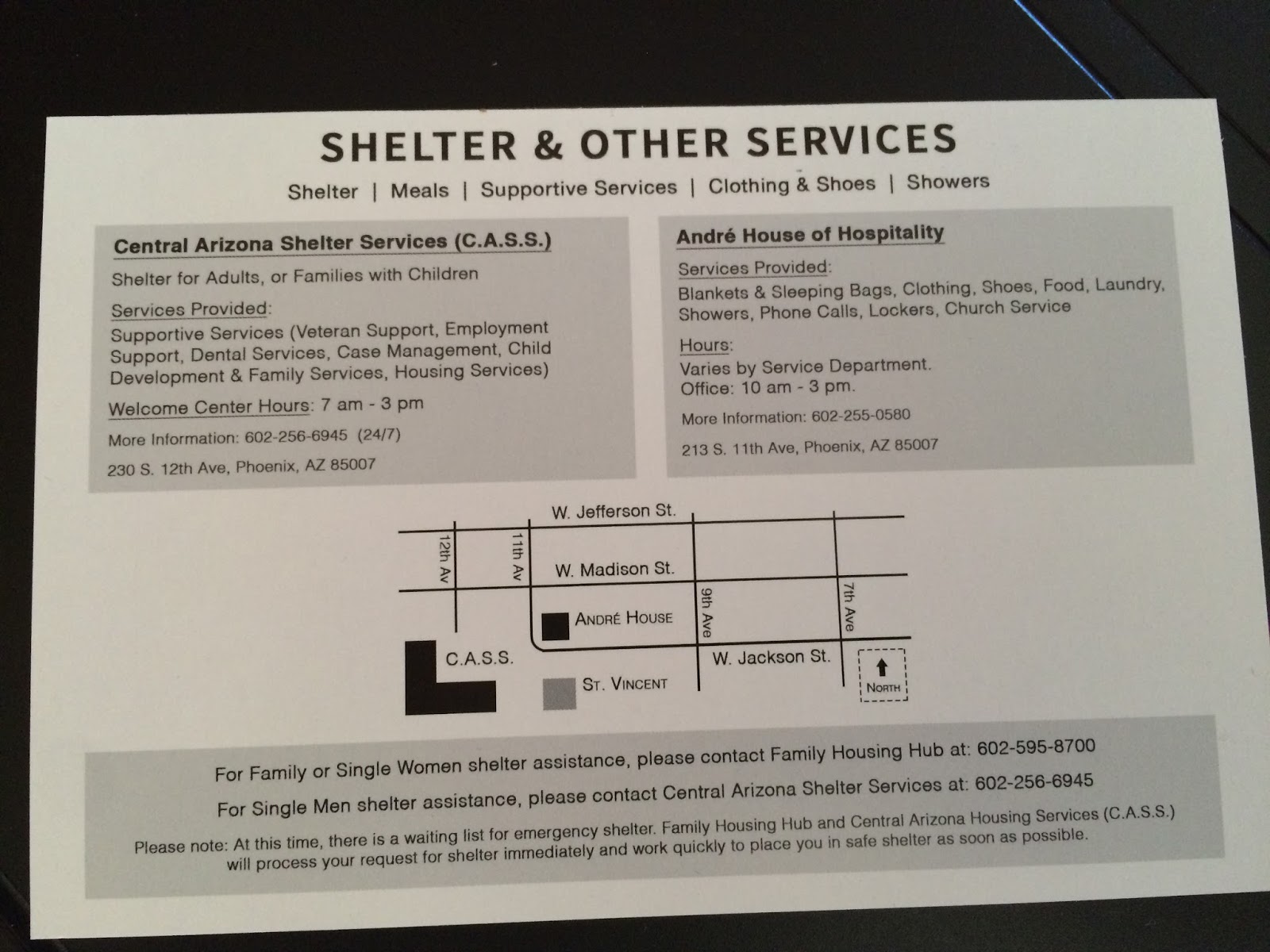 - We share shelter and diner information in the Phoenix area that support homeless individuals and families.